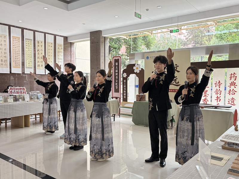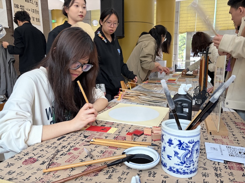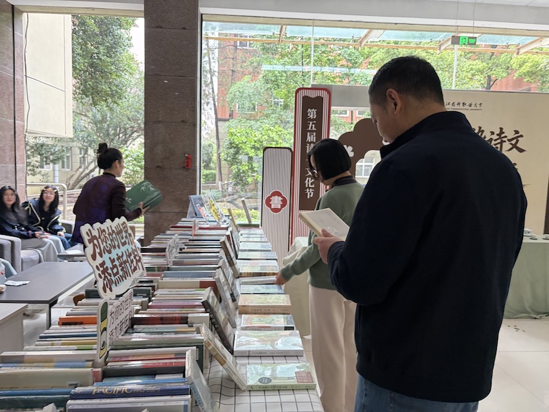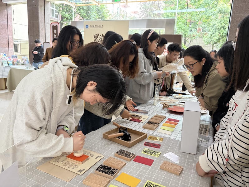 开幕式结束后,师生们参观体验了图书馆一楼大厅的创意集市,分为书香集市区、笔墨书香区、雕版印刷区三大空间。其中,书香集市区布置了“诗韵书香”散文诗歌主题书展,并联合新华书店推出年度热销书单;笔墨书香区展览了师生优秀原创书法作品,并提供书法体验空间,供师生在书签、扇面、宣纸上自由创作;雕版印刷区介绍雕版印刷的历史文化,演示雕版印刷工序,带领师生亲手体验这一中华传统工艺。活动现场书香氤氲,墨香四溢,师生参观主题书展、欣赏书法作品、体验书法及雕版印刷工艺,书香校园文化与中华传统文化相互交融、意趣盎然,师生共享书香之乐、共赏笔墨之美、共品技艺之趣。
