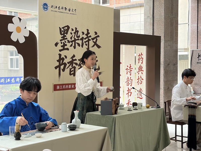 在铿锵的诗朗诵中,同学们演绎了《卷入山河·浙药青年诵》,浙药青年从东海之滨到四明山巅,用脚步丈量山河,用誓言守护健康,尽显蓬勃向上的青春力量。在悠扬的古琴音中,同学们带来茶艺表演《宋点明烹伴琴韵》,以一片茶叶为引,展现了其从深山云雾走向杯中清茗的旅程,承载着华夏文明千年智慧,全场师生沉醉在袅袅茶香与古韵琴音中,共同感受中华传统文化的隽永魅力。