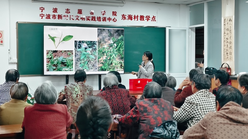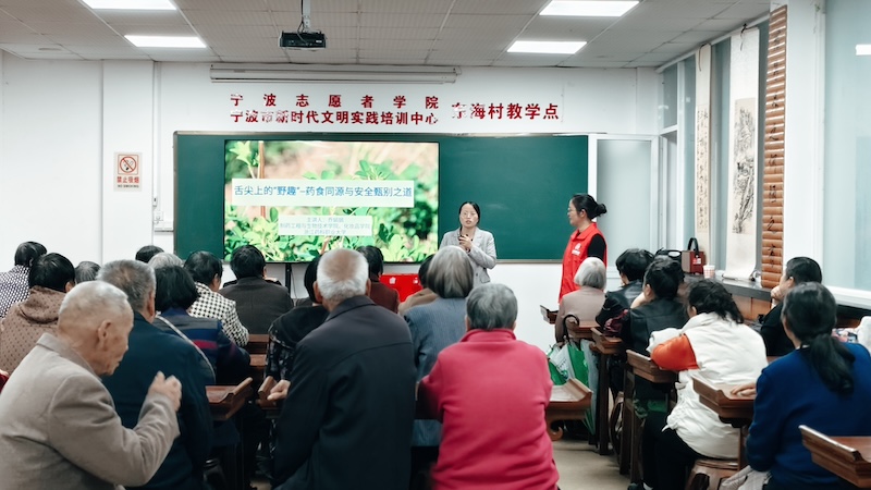 4月22日下午,“舌尖上的‘野’趣——药食同源与安全甄别之道”专题课程在慈溪市东海村的老年大学举行,百来位老年人认真听课,仔细辨别。这是浙江药科职业大学制药工程与生物技术学院“药管家”团队入村开展志愿服务的日常,一批批“懂药的年轻人”在专业老师的带领下奔赴乡村,用专业反哺乡土,把用药安全健康服务带进村民家里,用精准入户服务走进村民心里。