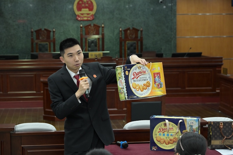 在海曙区人民法院,大学生与冯家小学师生一起在民事审判二庭庭长俞洁引导下,共同参观知识产权典型案例展。网红食品外包装、爆款纸巾商标设计等贴近生活的真实案例,让抽象的专利、商标、著作权知识变得可触可感,让青少年真切懂得:日常小设计背后藏着大产权,每一份创新成果都应被尊重与保护。