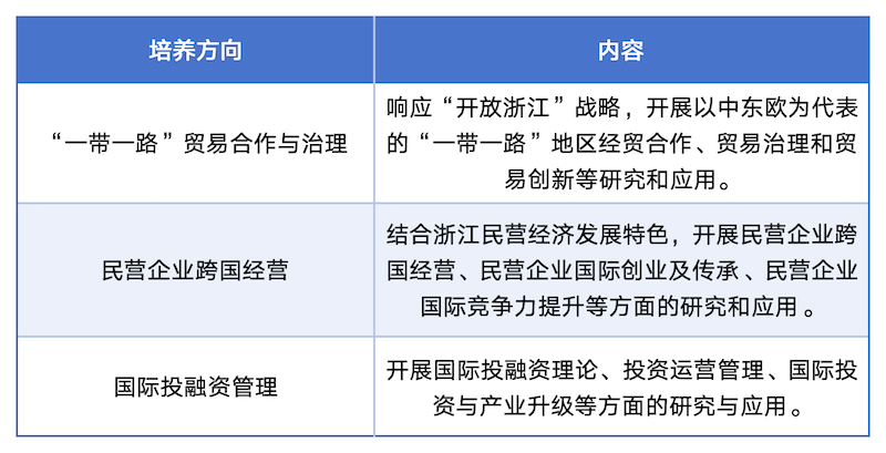 立足宁波舟山国际大港优势,依托宁波海上丝绸之路研究院(省智库)、宁波中东欧国家合作研究院(省培育智库)等“3院4中心”的科研平台优势,开展中东欧经贸合作等领域的研究和应用;利用学校国际化资源,依托丝绸之路商学院联盟开展国际合作教学,并与宁波诺丁汉大学、北京外国语大学等20余所高校和科研机构在研究生培养等方面建立了合作关系;现有多名教师具备国际化背景,并积极通过“引进来”和“走出去”的师资建设方式,打造国际化师资队伍。