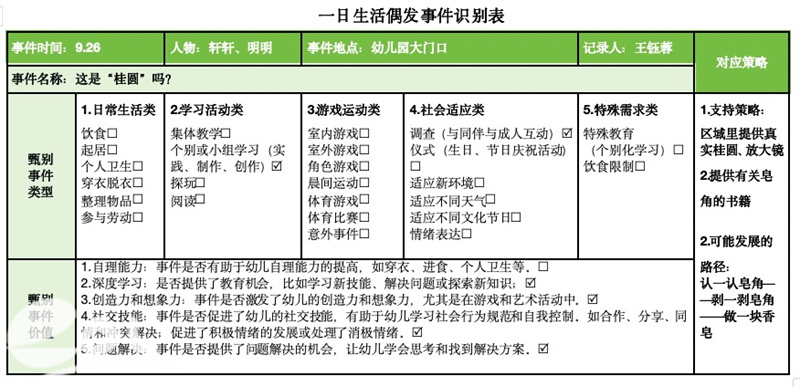 事件捕捉:重点在捕捉幼儿的偶发事件(发现一颗果子)。采用全景式扫描,定点式、追踪式等方法观察,用简洁的勾选记录自己当下采用的捕捉方式,用关键词记录发生的事件细节,用便捷的方式,将“看到的事件”利用勾选、关键词等方式,捕捉那些反映幼儿内心世界和潜在教育价值的关键瞬间。有效地将“现象”转化为具体的“契机”。