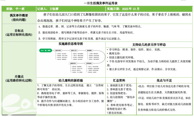 事件运作:此阶段是将经过分析后的事件转化为实际的教学活动。这意味着教师不仅要基于幼儿发现一个不明的果子事件设计出符合中班儿童年龄特点和发展水平的学习任务,还要确保这些活动能够真正回应孩子的兴趣点和挑战。通过转化,每个偶发事件都能成为一次宝贵的教育机会,促进儿童在认知、情感、社会技能等方面的成长。