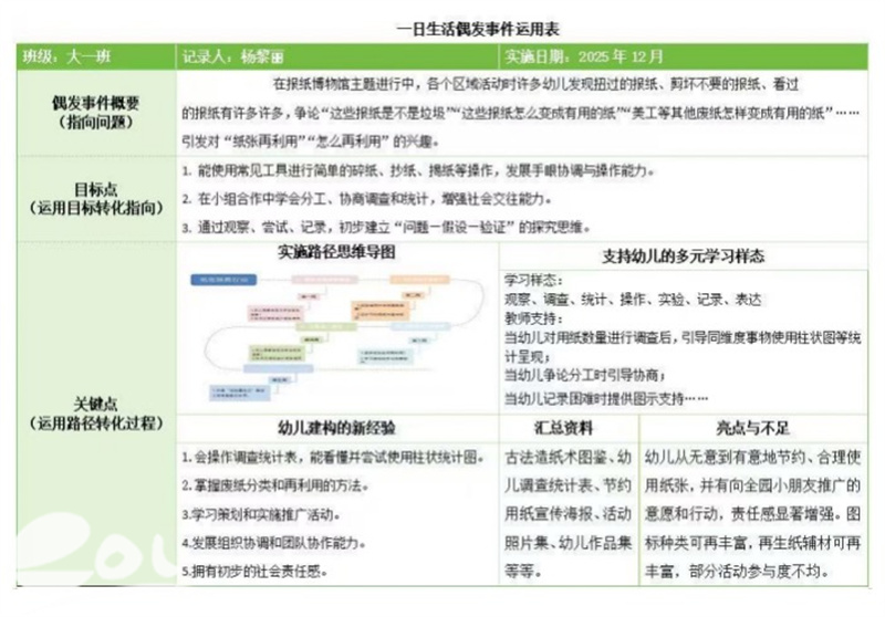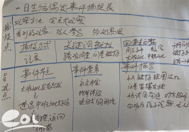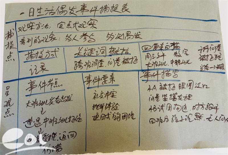 在前期实践积累的基础上,研修进入核心的策略提炼与转化阶段。本次全体教师围绕大班幼儿“项目调查受挫”案例为载体——孩子们精心设计的采访问卷遭到其他班级部分小朋友拒绝,信息收集受阻导致项目推进陷入低迷事件,以“一日生活偶发事件捕捉表”“偶发事件识别表”“偶发事件运作表”为实操工具,展开深度实战研讨,各有侧重并形成转化方案: