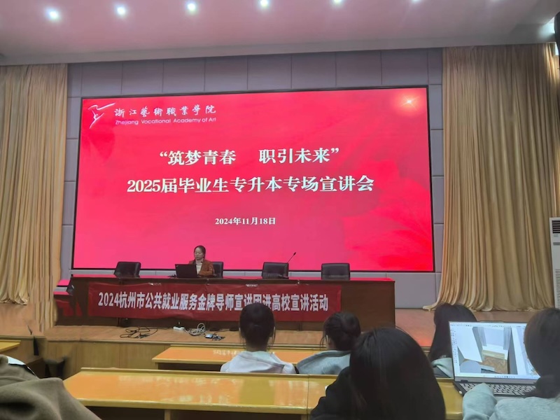 为加大浙江艺术职业学院就业指导服务力度,引导毕业生积极主动求职,促进2025届毕业生顺利毕业、尽早就业,11月18日、21日,学校2025届毕业生就业专场宣讲会暨杭州市公共就业服务金牌导师宣讲团进高校活动在图信中心报告厅举行。宣讲会由浙江同济科技职业学院就业办公室主任、杭州市公共就业服务金牌导师桑梦蝶,高级农艺师、杭州市公共就业服务金牌导师莫元波分别围绕“专升本考试政策”“大学生面试技巧与就业创业政策解读”两个主题进行宣讲。