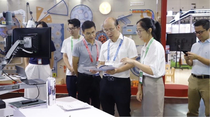 步入展位,一座颇具未来感的“透明工厂”模型映入眼帘,虽展位空间有限,但独特的设计瞬间抓住观众视线。参观者通过现场屏幕展示,便能直观感受数字化车间的运作,了解智能机器人完成汽车零部件装配的过程;指尖轻触屏幕,产教融合案例以动态数据形式呈现,让原本抽象的教育理念变得生动易懂。