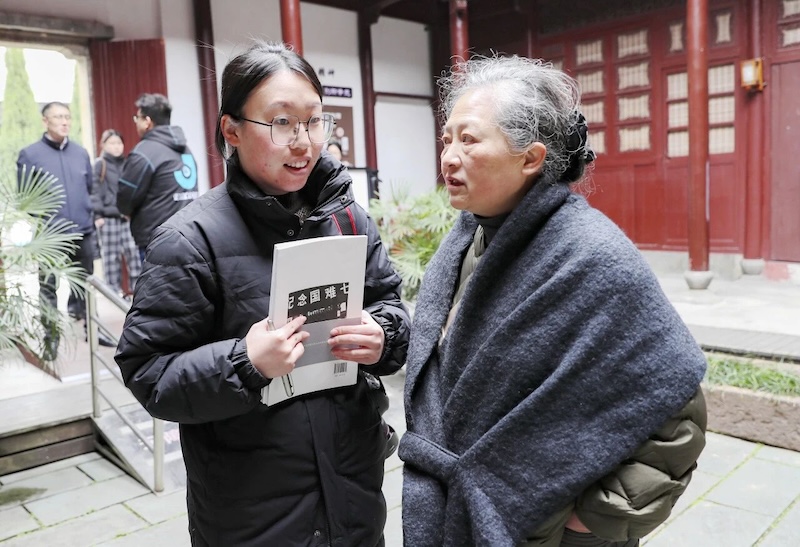 自2023年入读衢州职业技术学院后,李珊珊在老师的指导下长期关注侵华日军细菌战衢州受害者选题,多次采访被誉为“细菌战斗士”的中国细菌战受害者诉讼原告团团长王选(右)