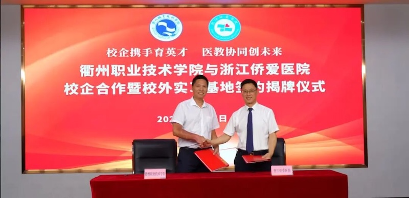 6月25日下午,衢州职业技术学院与浙江侨爱医院校外实习基地签约揭牌仪式在常山县举行。市委常委、统战部部长张朝雄,市侨联主席马伟民,常山县委常委、统战部部长陈贤民,县政府副县长王竟达、县卫健局局长姚肖忆,中国侨联常委、浙江侨爱医院董事局主席廖志仁、执行院长刘伟平,校党委书记徐须实等出席。