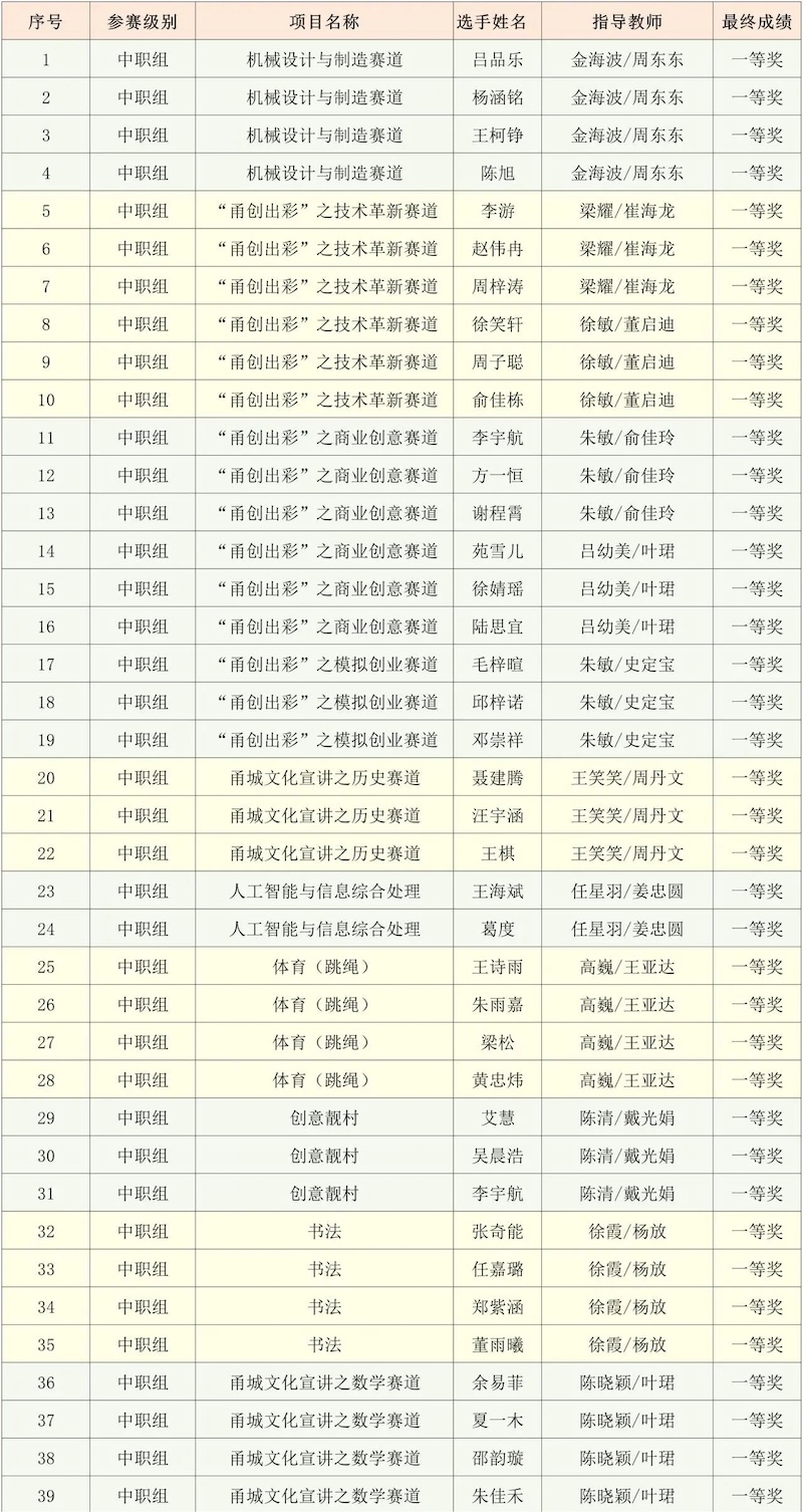 赛场上,鄞州职教中心选手表现亮眼:中职组赛道中,机械设计与制造项目摘得头筹;学生素养类成为“获奖主力”,甬城文化宣讲(数学、历史赛道)、“甬创出彩”技术革新/商业创意等6个方向拿下一等奖,书法、体育(跳绳)等素养项目也同步夺冠;教师技能类的增材制造、跨境电商项目双双斩获一等奖;终身教育类的“创意靓村”项目同样登顶,实现了多领域奖项的全面突破。