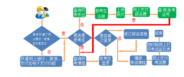 2.老考生报考时,使用准考证号登录网站报考(登录密码为身份证号),完善考生信息,选择考试地点,填报课程,在线支付报考费用,在规定时间内完成报考过程。