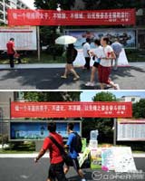 横幅挂在学园入口两侧,9米长,看到横幅后,不少学生专门驻足拍照。